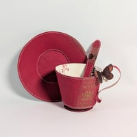 A one off decorative stitched teacup, saucer and spoon set created from a vintage end of life copy of 'The Collins Guide to Roses', and uses both the book cover and its pages. This piece showcases the rich red and beautiful gold lettering of the cover, and has a paper butterfly perched on the handle of the teacup.