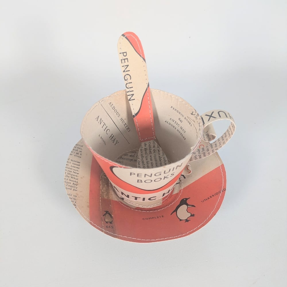 A beautiful decorative stitched teacup, saucer and spoon set created from a vintage, end of life copy of 'Antic Hay' by Aldus Huxley. Penguin Books. The work is created by manipulating and stitching the papers to create the forms. They can also be made from your own papers or love letters.