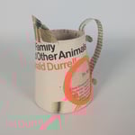 My Family and Other Animals by Gerald Durrell- A cream cover with a neon orange hand Picot stitched circle.